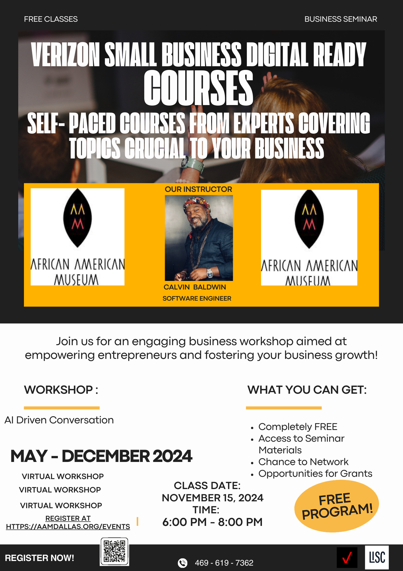 Join us for a dynamic business seminar by Verizon Small Business Digital Ready, featuring self-paced courses from industry experts on topics crucial to your business's success. Led by Calvin, a seasoned Software Engineer and instructor, this workshop will focus on "AI-Driven Conversations" to empower entrepreneurs and foster business growth. Hosted at the African American Museum of Dallas, this engaging event offers participants free access to seminar materials, valuable networking opportunities, and the chance to explore grant options. Don’t miss this unique opportunity to elevate your business with AI insights and connect with fellow entrepreneurs!