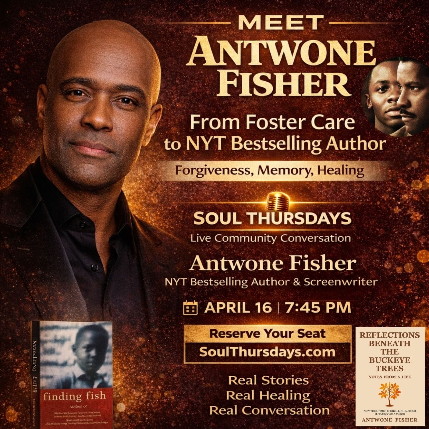 Antwone Fisher is a New York Times bestselling author and screenwriter whose life story inspired the acclaimed film Antwone Fisher. Raised in foster care and overcoming homelessness as a teenager, Fisher transformed his life experiences into the bestselling memoir Finding Fish. His newest book, Reflections Beneath the Buckeye Trees: Notes from a Life, reflects on forgiveness, memory, and the lessons learned across a lifetime.